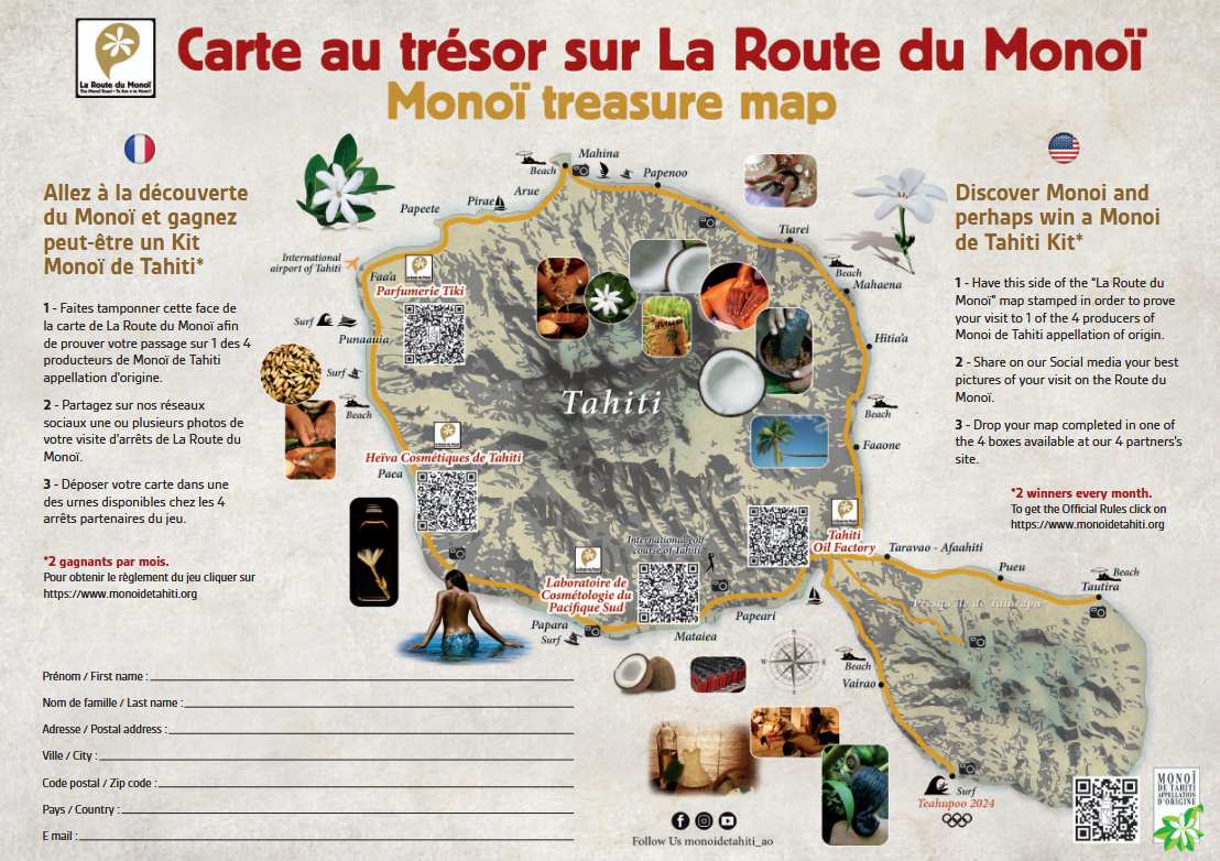 From July 1, 2024, the GIE Monoï de Tahiti is organizing the game “Treasure Map on The Monoï Route®” in order to (re)discover the first tourist circuit on the island of Tahiti.